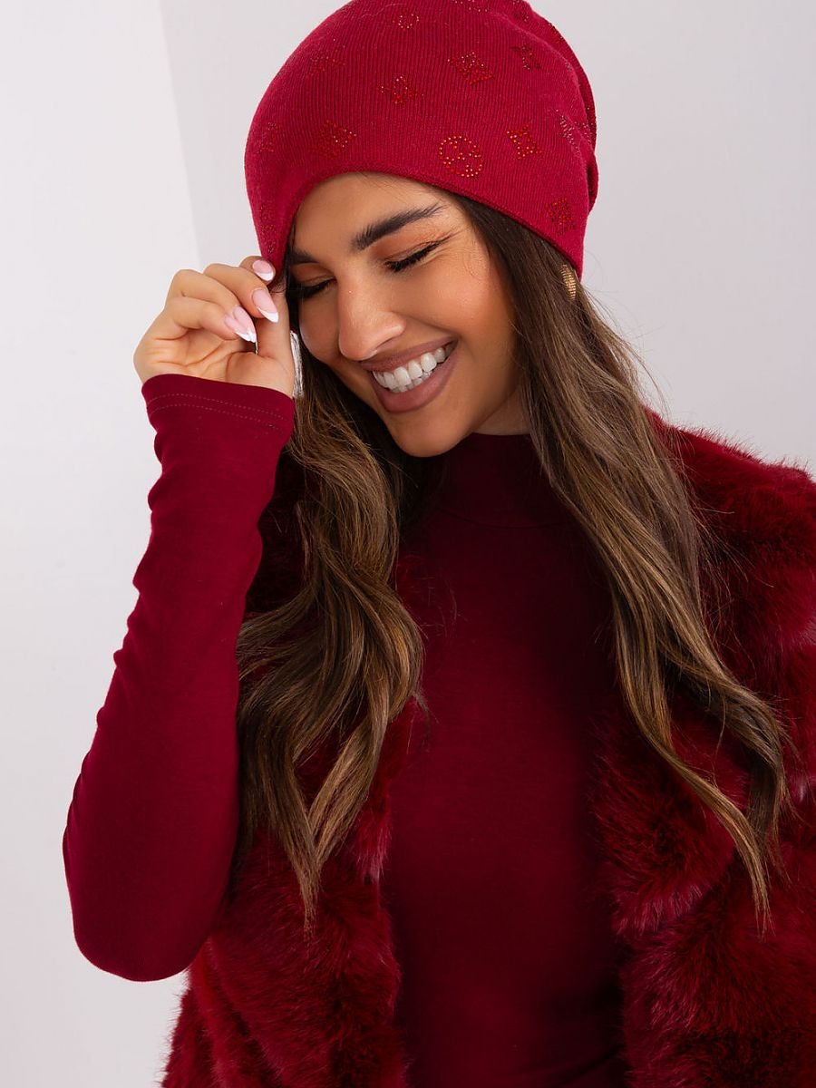 Warm winter women's beanie hat with cashmere, with decorative rhinestone application.